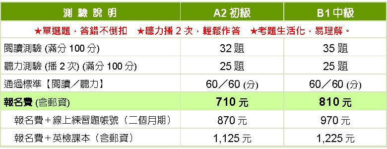 | 1. 准考證:測驗日前7-10日,「平信」寄發至通訊地址。 2. 成績單及通過證書,於測驗後四週,「掛號」寄發至通訊地址。 3. 測驗日:攜帶准考證、身份證件、2B鉛筆、橡皮擦應試。 4. 低、中低收入戶者,享報名費減免50%優惠,請檢附證明文件,最遲於「報名截止日前」, e-mail至exam.a@iltea.org,逾期不受理。經本中心審查無誤後減免報名費於測驗當日以 現金退回。 【補助規範】 ①需應考當日全程完成應試者(未出席應考者不予補助) ②一年內不限級數,補助二次為限。 5. 匯款、報名等相關問題,詳洽(02)2311-2939 洽詢時間:週一~週五 09:00-17:00 |